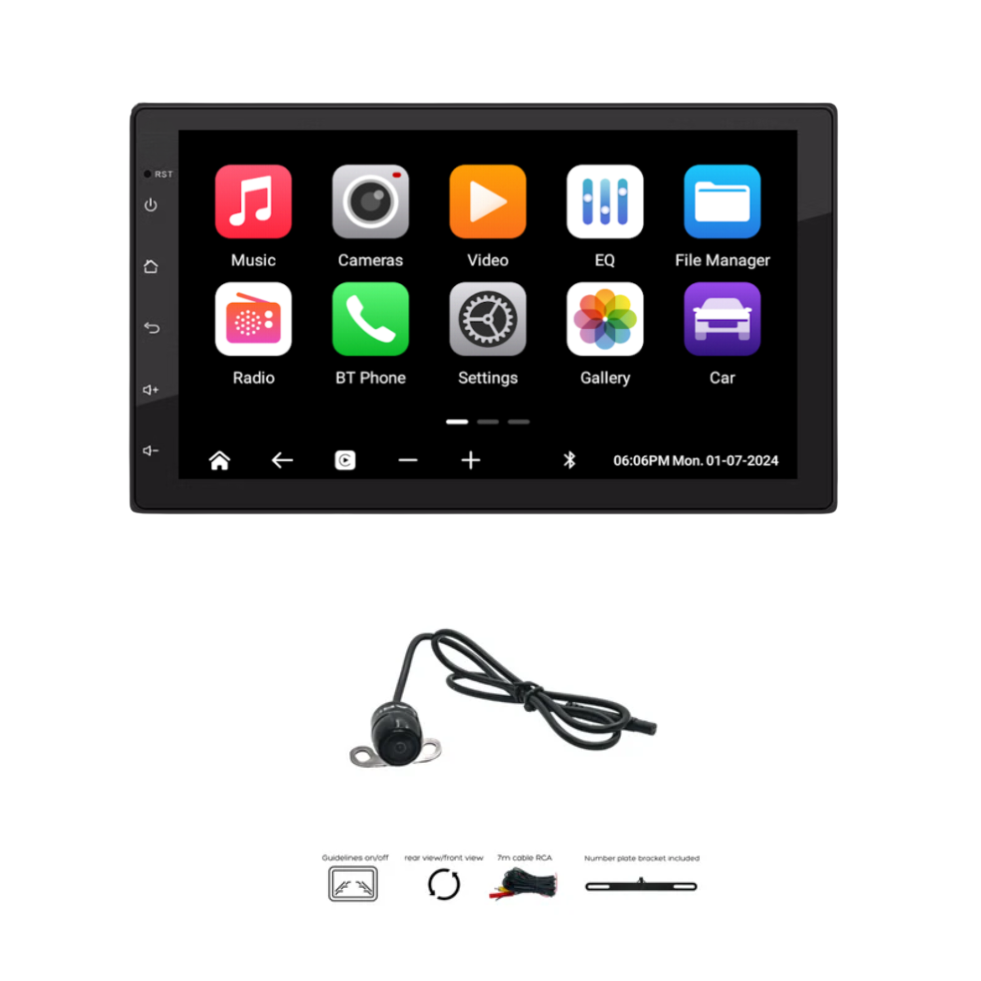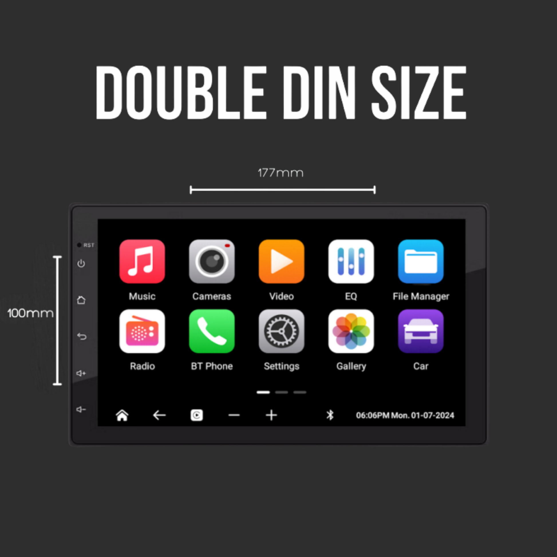 - Universal Double DIN (177mm) Head Unit with a 7″ Q-LED Screen