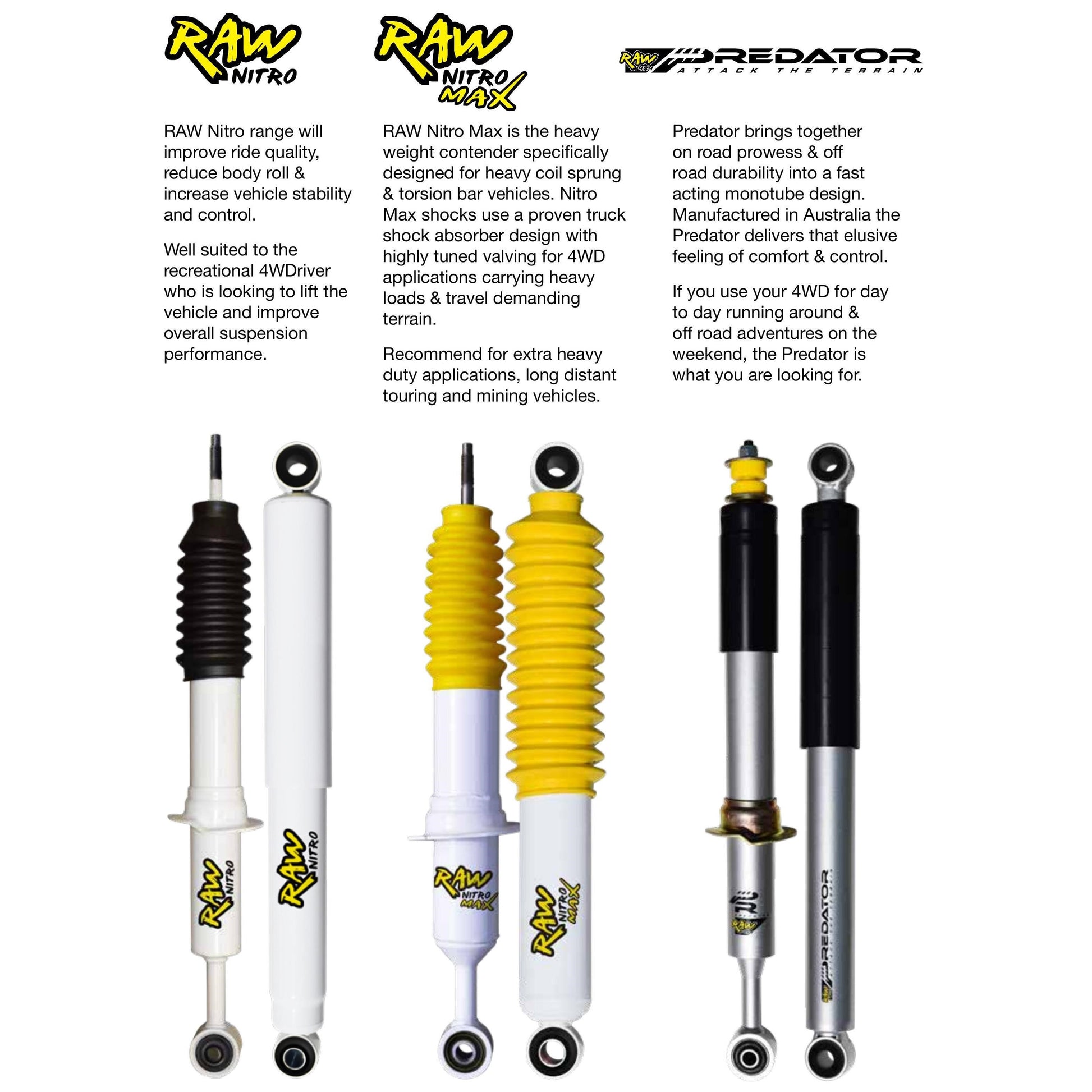 • RAW 4×4 Nitro Max is the heavy weight contender of the RAW shock absorber range specifically designed for heavy vehicles. As a proven truck shock absorber, the Nitro Max is equipped with highly tuned valving for 4WD applications while carrying a heavy load over demanding terrain. 41mm/45mm Bore Nitrogen Gas Technology
