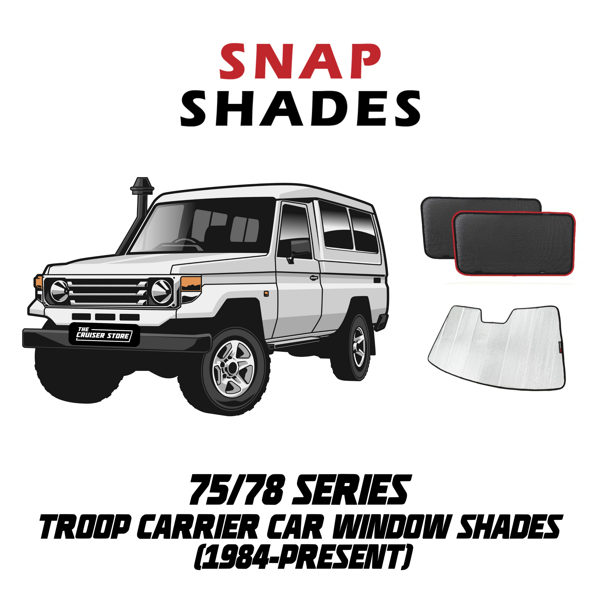 - Ensures maximum protection from the sun with your Toyota LandCruiser Snap Shades .